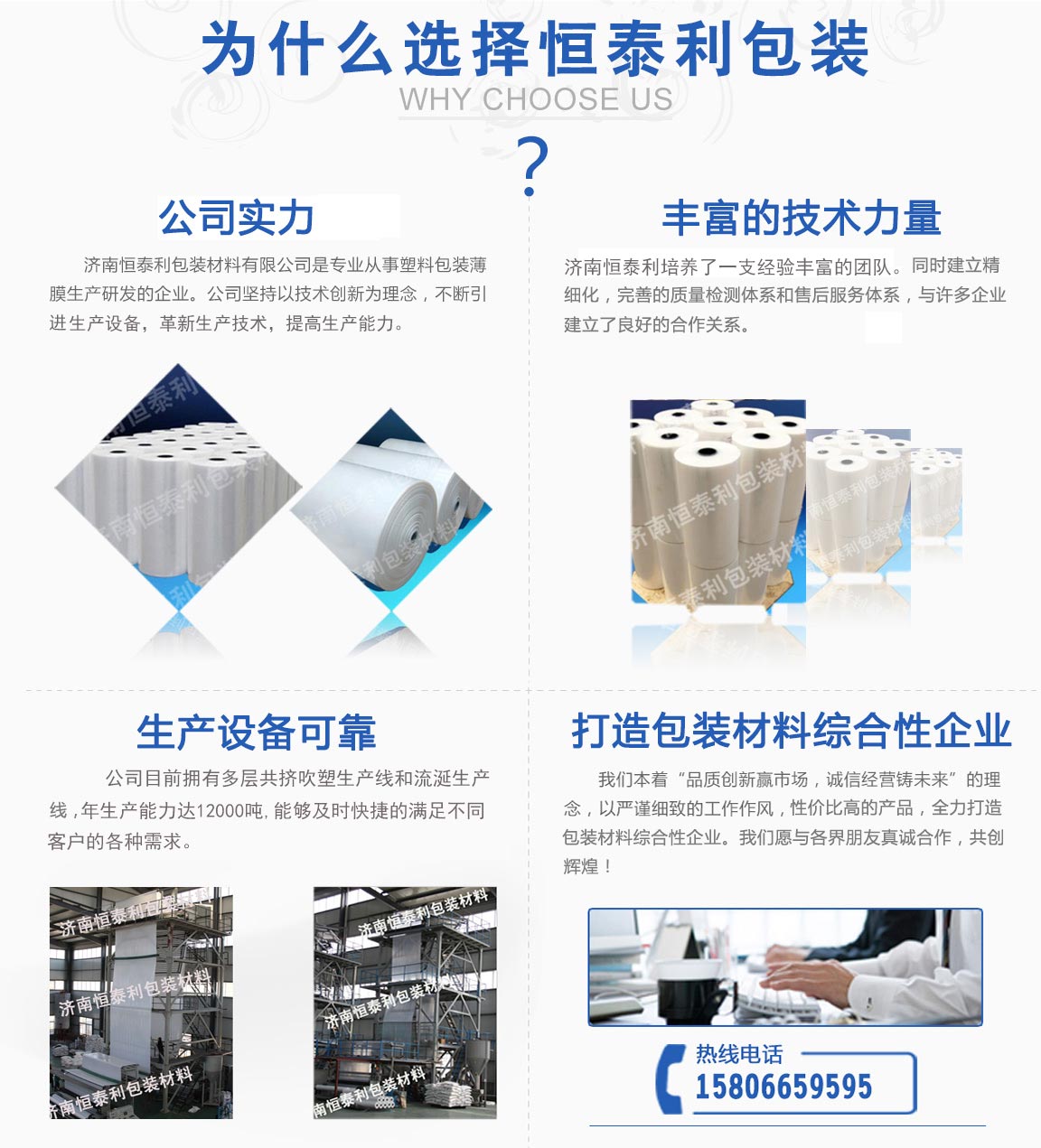 濟(jì)南恒泰利包裝材料有限公司位于濟(jì)南市市中區(qū),是從事塑料包裝薄膜生產(chǎn)研發(fā)的企業(yè)。公司成立十幾年以來,堅(jiān)持以技術(shù)創(chuàng)新為理念,不斷引進(jìn)生產(chǎn)設(shè)備,革新生產(chǎn)技術(shù),提高生產(chǎn)能力。并堅(jiān)持自主創(chuàng)新,加強(qiáng)企業(yè)管理,培養(yǎng)了一支經(jīng)驗(yàn)豐富的團(tuán)隊(duì)。同時(shí)企業(yè)建立高標(biāo)準(zhǔn)、精細(xì)化質(zhì)量檢測(cè)管理體系和完善的售后服務(wù)體系,與國內(nèi)外許多家企業(yè)建立了良好密切的合作關(guān)系。公司目前擁有多層共擠吹塑生產(chǎn)線和流延生產(chǎn)線,年生產(chǎn)能力達(dá)12000噸,能夠及時(shí)快捷的滿...